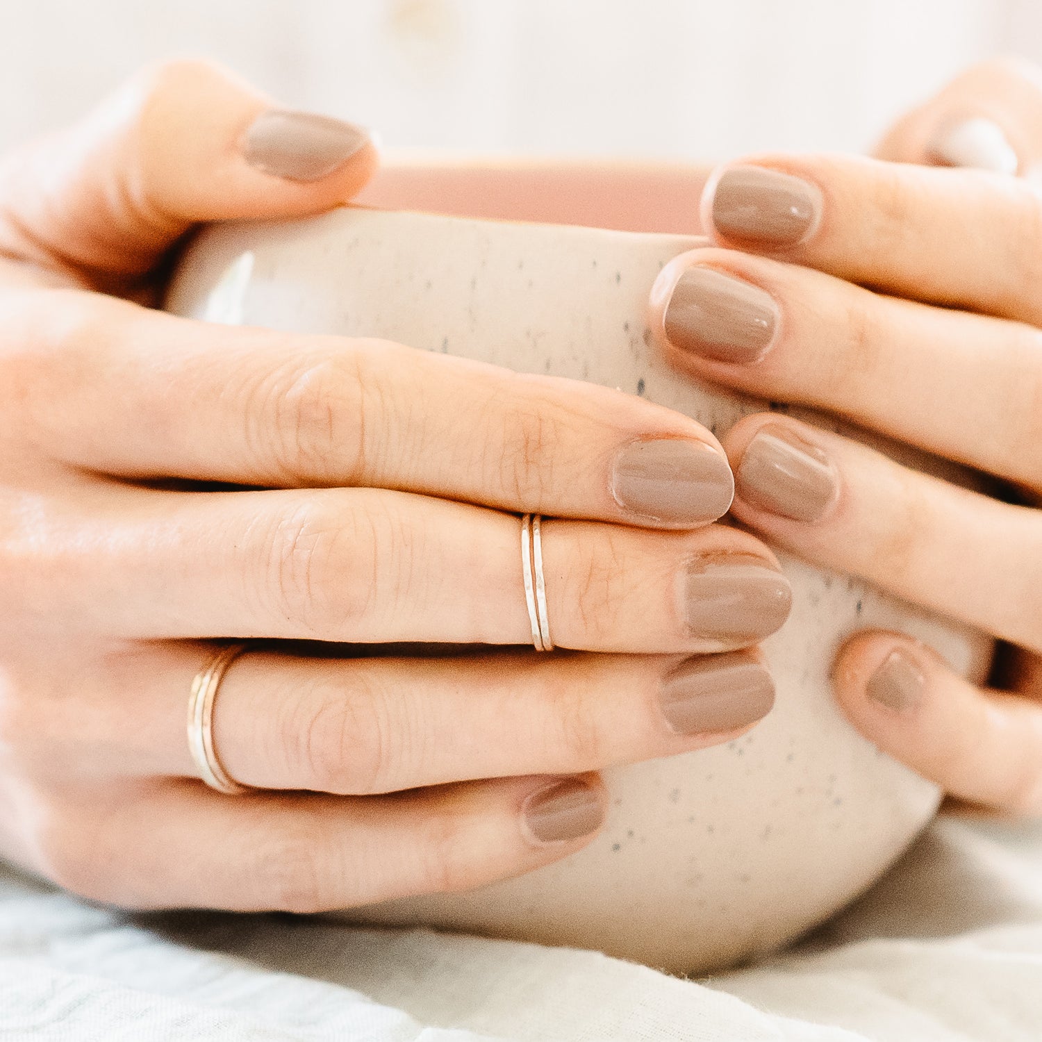 This ring is made from 1mm solid 9ct gold, really slim and comfy, with a smooth or delicate hammered texture.